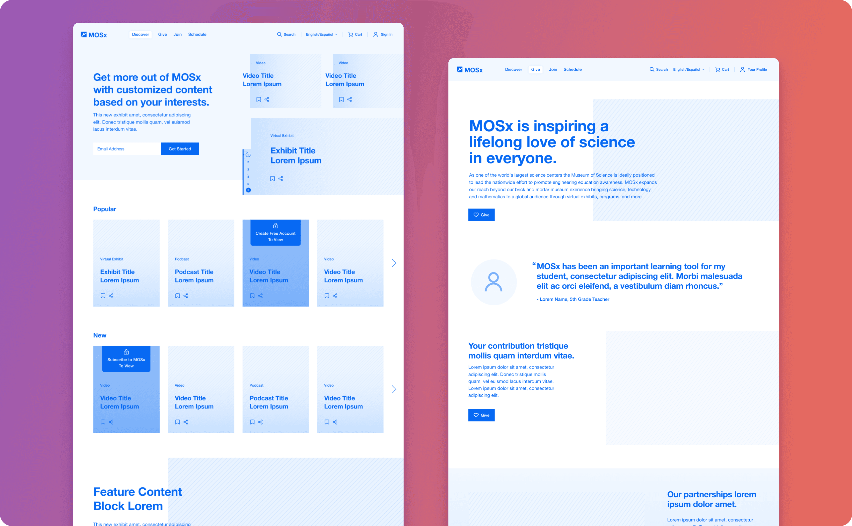 MOSx sought to establish itself as the "cooler younger sister" rather than a cousin to the Boston of Museum of Science that lived within the same brand family, but in its own distinct way. I increased the brightness of the secondary MOS brand colors and used them to create a delightful glowing gradient effect to engage and mesmerize users. This appears in backgrounds, on hover of certain elements, and in illustrations.