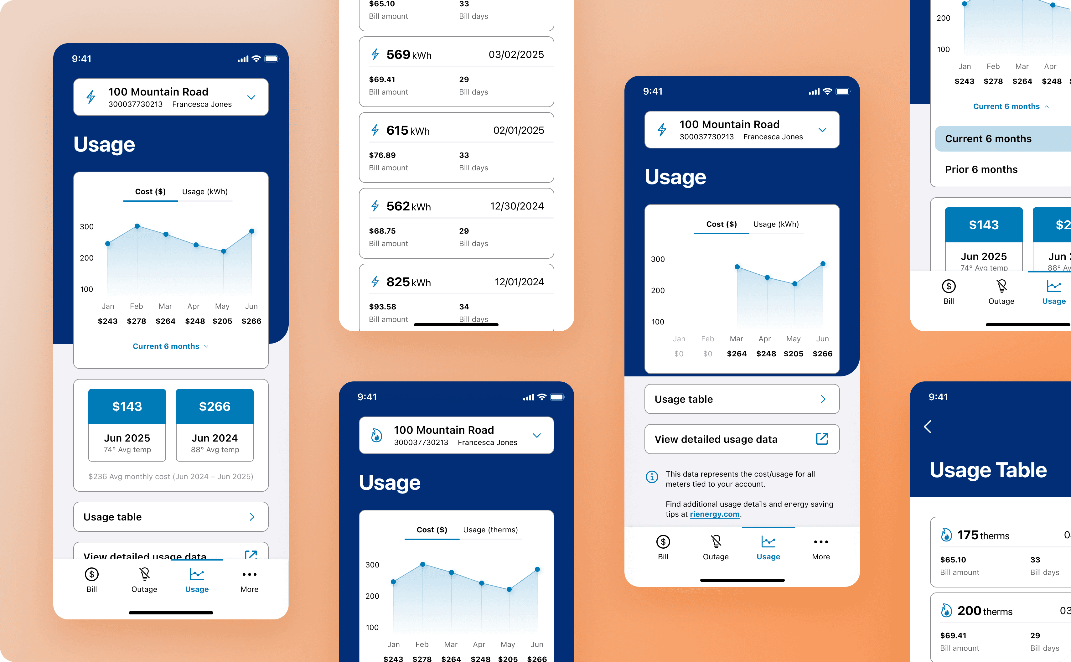 In 2021, I designed the usage experience during Phase 2 of the LKE mobile app development using the established design system and workflow paradigms. This included a usage graph, usage table, and several edge cases. We unfortunately didn't have the time or budget to develop an interactive graph that allowed users to tap and drag to see more usage data than the screen space allowed. My solution was a dropdown menu that allows users to switch between the current and past 6 months of data.