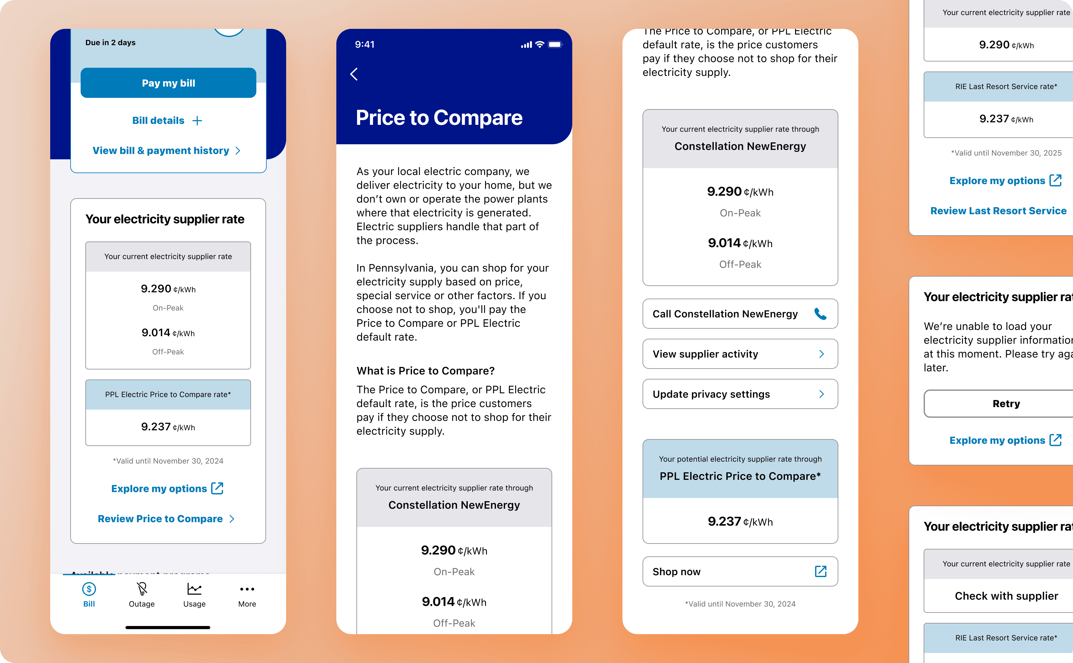 After usage, I designed the paperless billing enrollment experience, supported the LKE team with small app updates, and mentored a junior designer on their work designing the cashless pay experience. I became well-versed in the world of LKE. I used this historical knowledge to design new experiences and guide the visual direction of the new PPL apps for Pennsylvania in 2024 and Rhode Island in 2025.