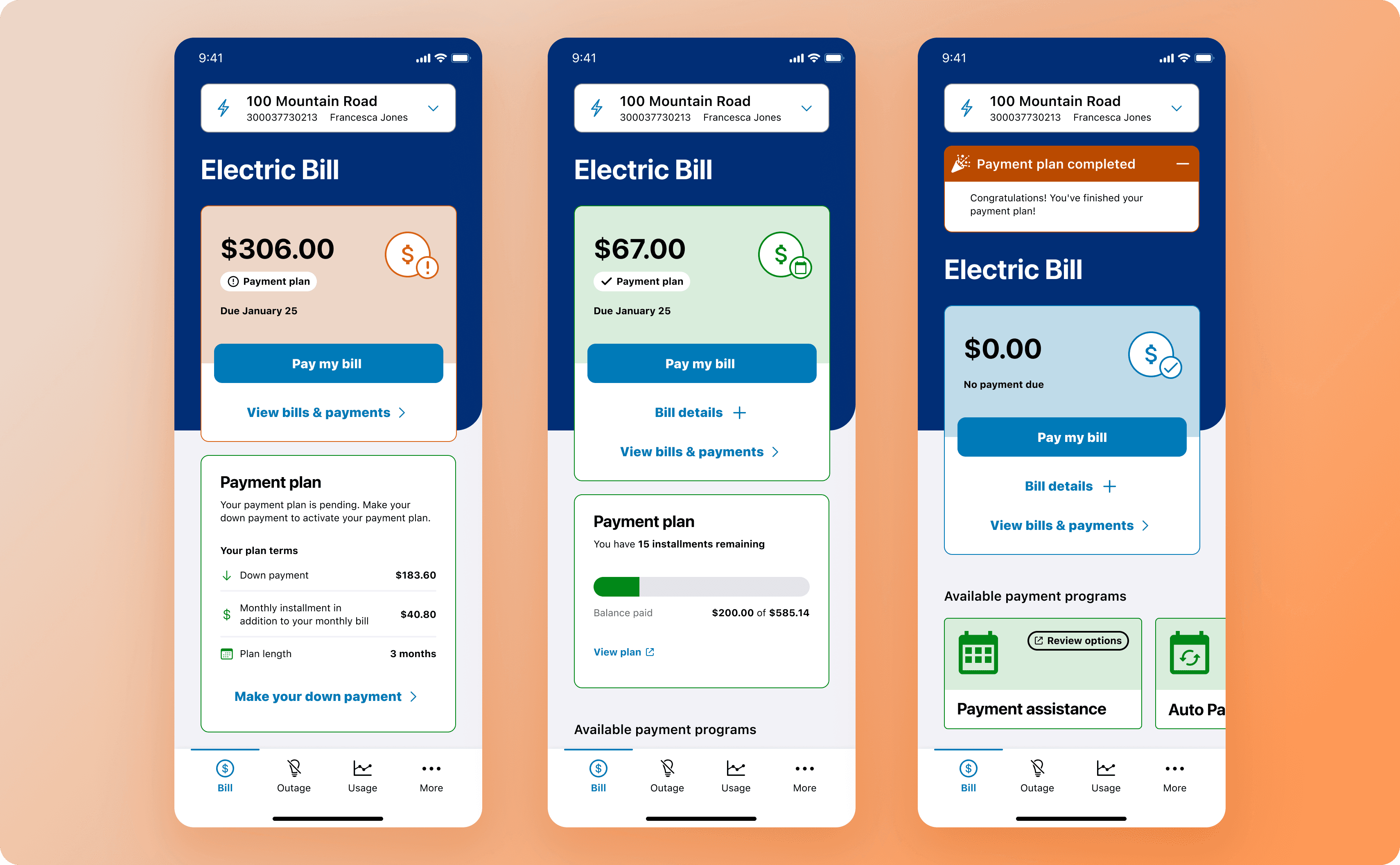 Brand new experiences needed to be designed for electricity supply shopping (Price to Compare) and standard and two specialized payment plans. For new workflows, we used the web experience designs as our user flow and adapted it for the mobile environment.