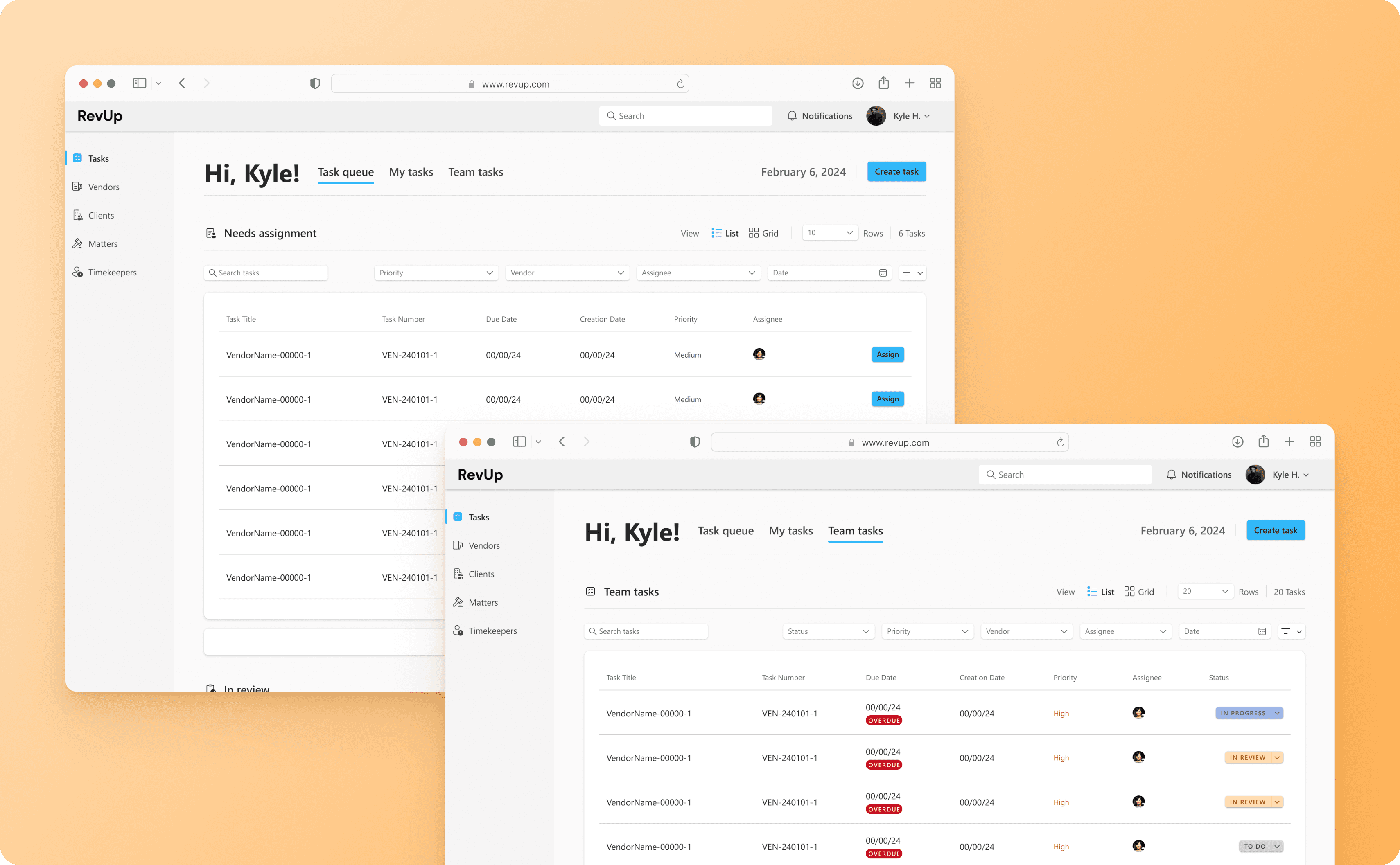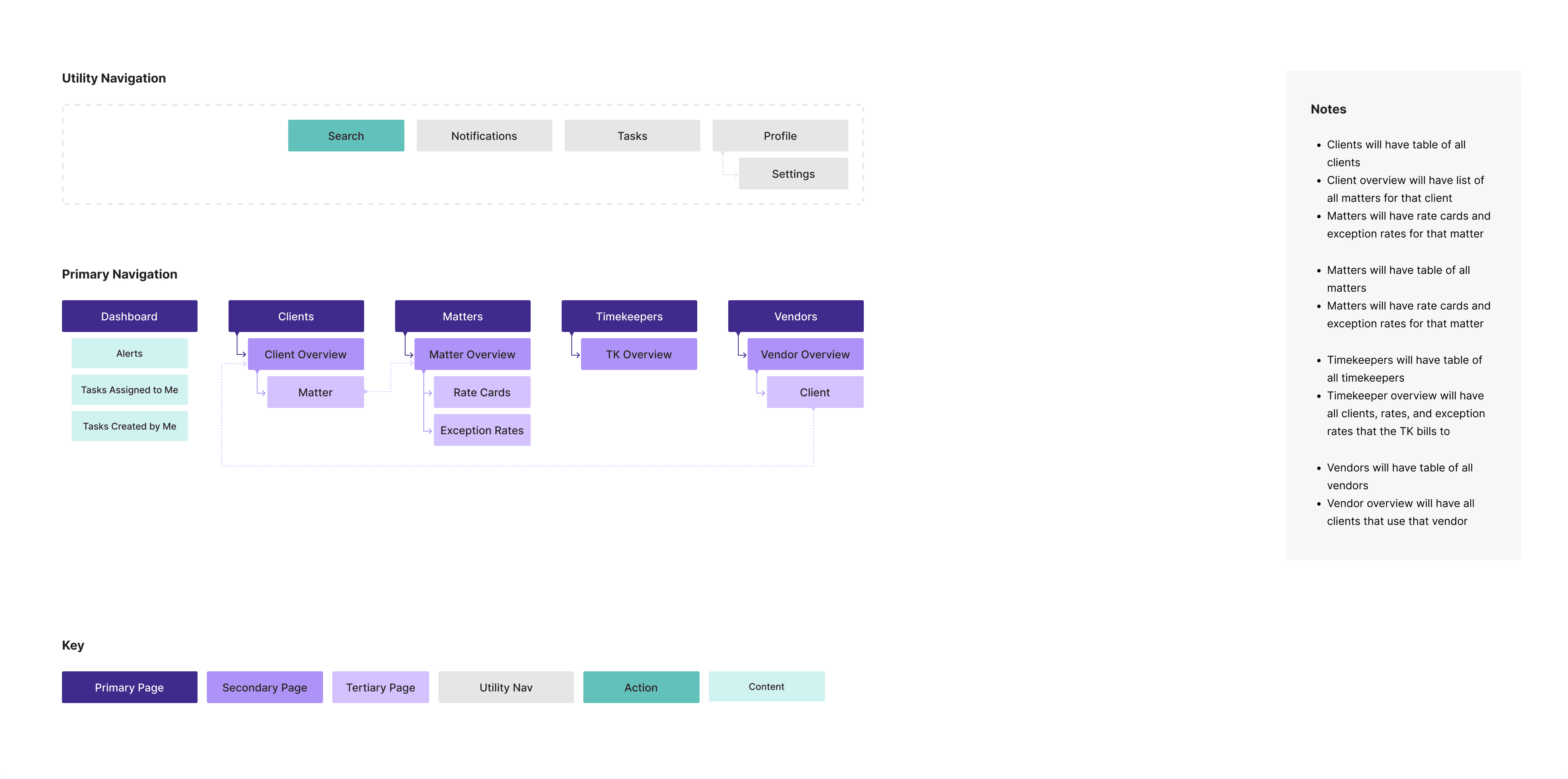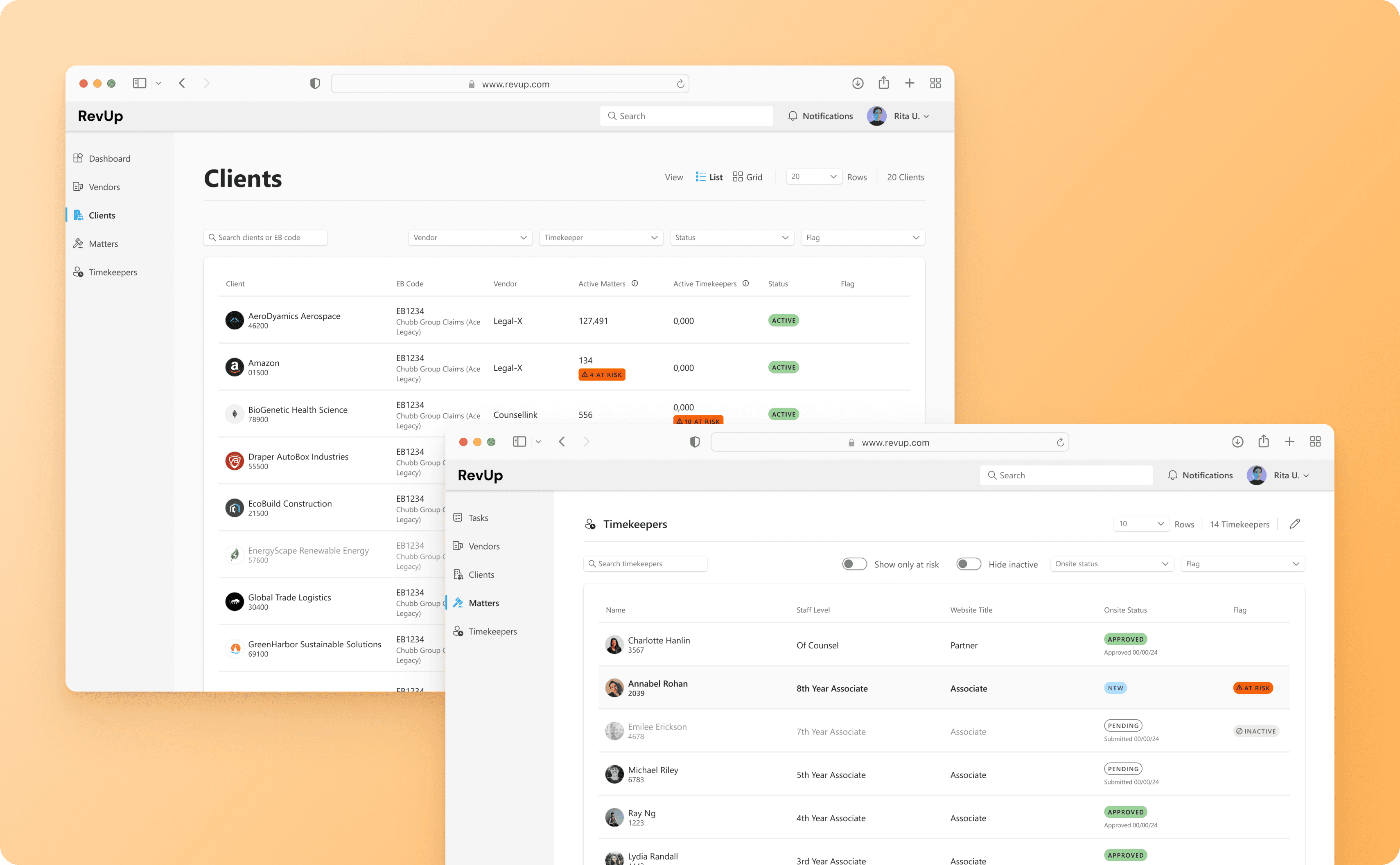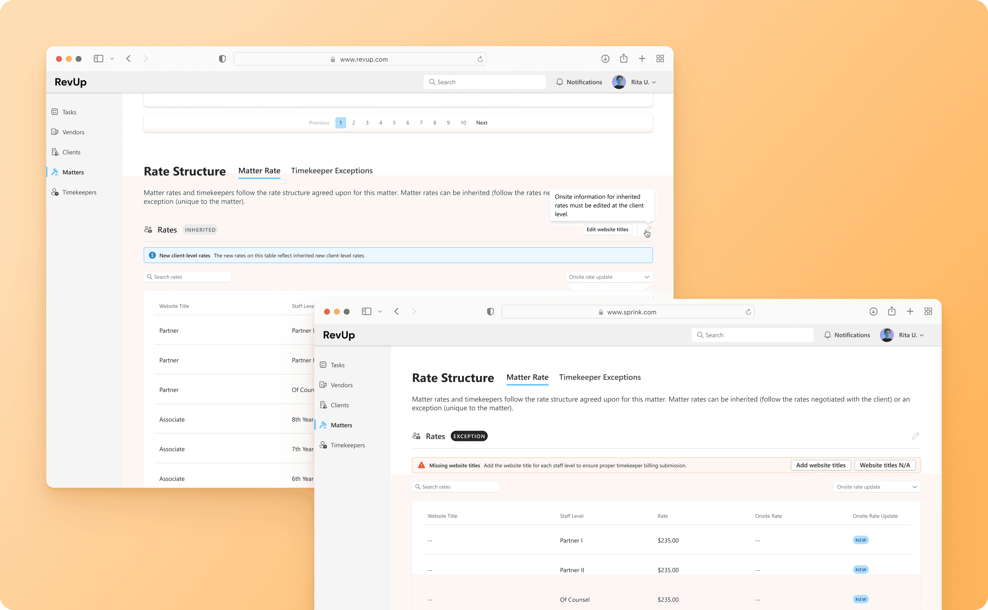 Changes to rates, timekeepers, and matters (cases) would be pulled from a database and flagged in the UI to notify users of new information, inconsistencies, & errors. These alerts would surface as banner and pill flags ranging in severity throughout the system that the user could take action on. The user had a single-pane view of alerts from the highest level that would allow them to drill down to where action was required.