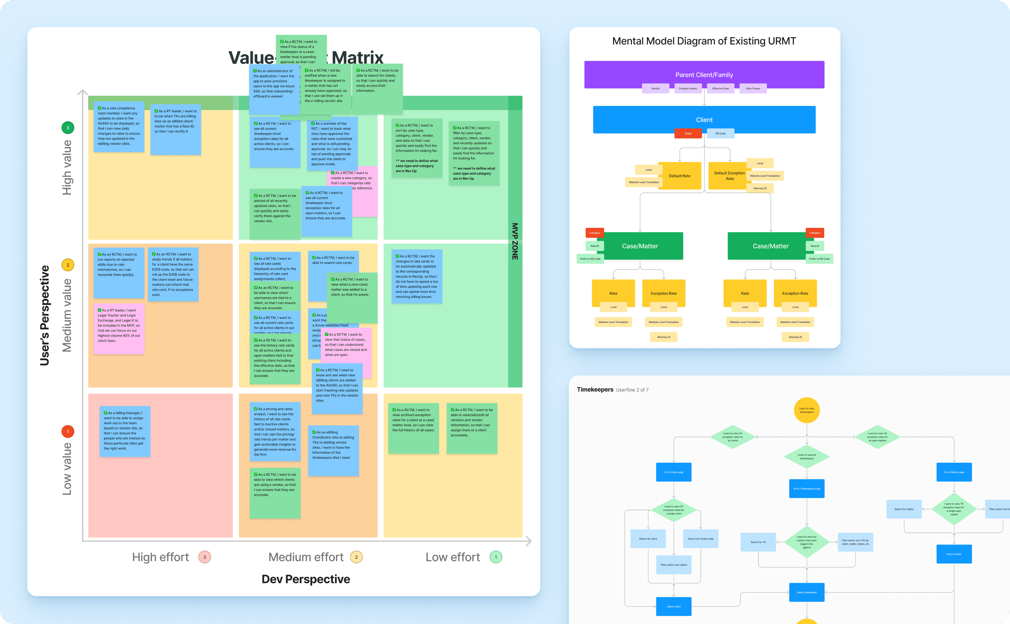 I began the project by watching client-provided training videos that were typically used to train new revenue services team (RST) members. I created a mental model of the new system, a site map, and high-level user flows based on these learnings and facilitated a workshop to prioritize user stories on a value-effort matrix.