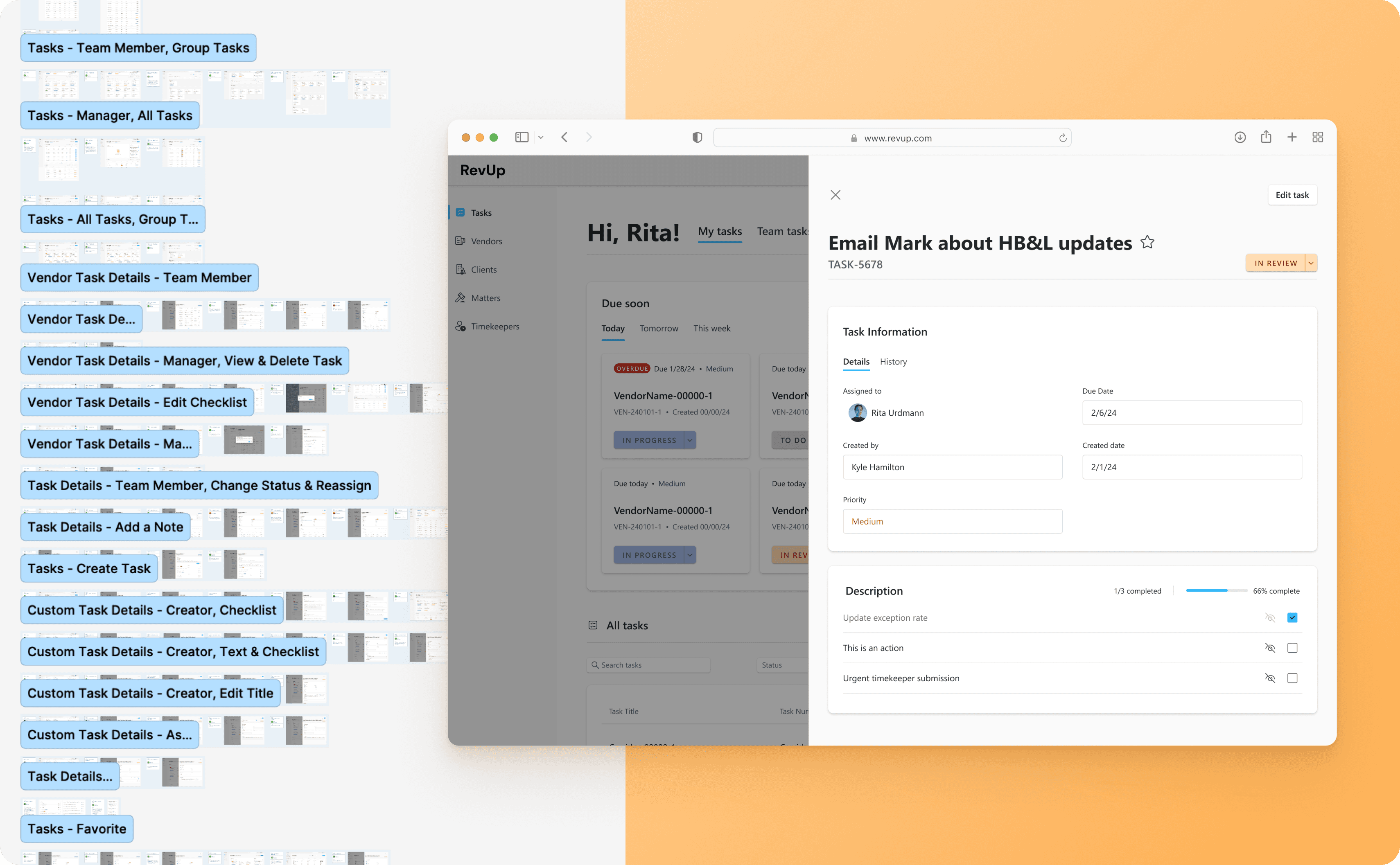 Actions would automatically be created for each flag and lumped into tasks. Team members could complete these actions, create a task for themselves, or a manager could delegate tasks out to their team. Relevant updates would cascade throughout the system so that they were updated one time in a single place.